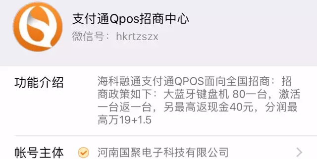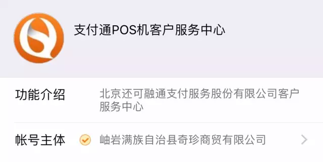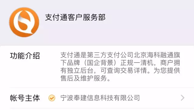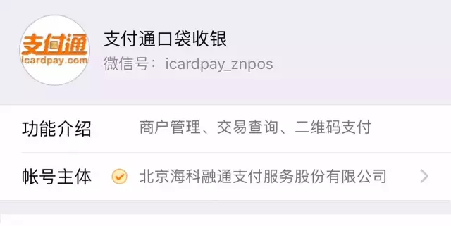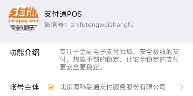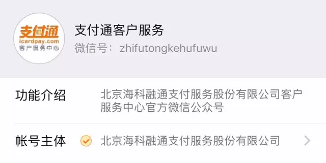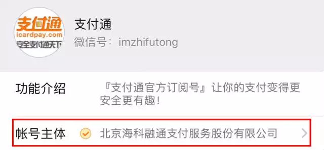 官方账号:账号主体为【北京海科融通支付服务股份有限公司】或【北京支付通电子设备有限公司】。